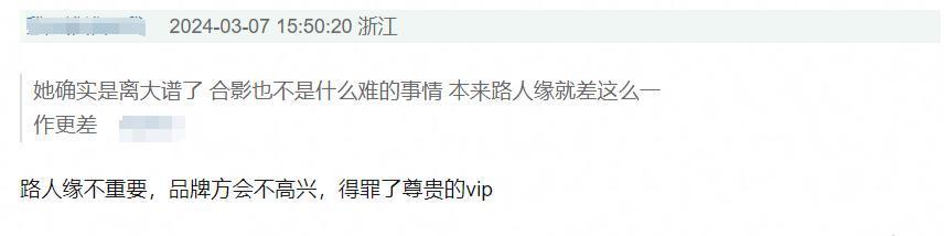 这一次,周冬雨不互助合照,先后被两位LV顶级贵客点名吐槽“全程臭脸”、“性情最大”,真的是踢到铁板了。受影响的不单是是周冬雨的路东说念主缘,还有她后续的商务资源。毕竟,得罪贵客会导致品牌方销售受影响,而品牌方能径直决定代言东说念主是否更换。